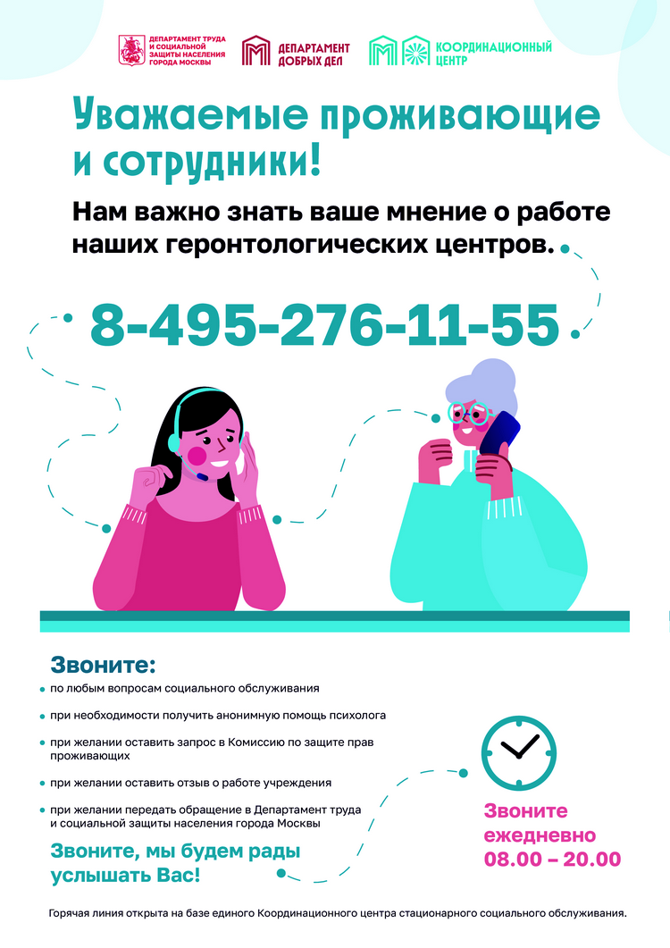 - Получить консультацию по вопросам социального стационарного обслуживания можно в едином Координационном центре Департамента труда и социальной защиты населения города Москвы по телефону: